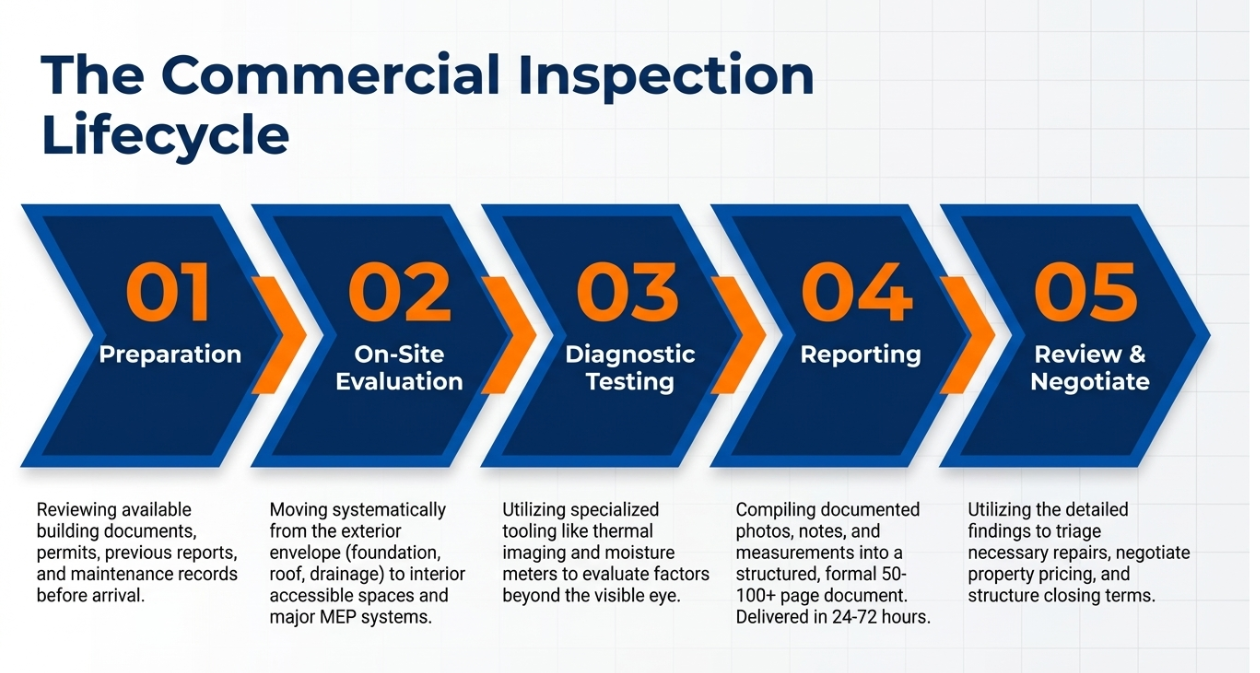 A commercial inspection isn’t just a walkthrough. It happens in stages, and understanding each one helps you set realistic expectations.