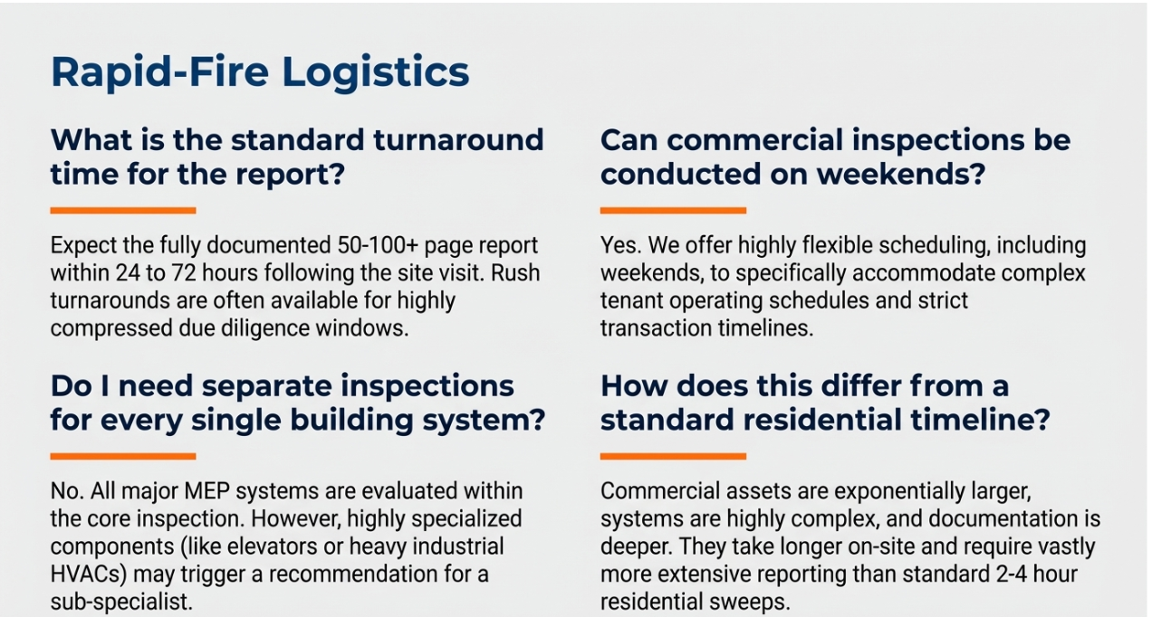After the on-site work is done, the inspector writes the report. For a thorough commercial inspection, expect the report to be delivered within 24 to 72 hours. Some firms offer faster turnaround for an additional fee if your due diligence timeline is tight.