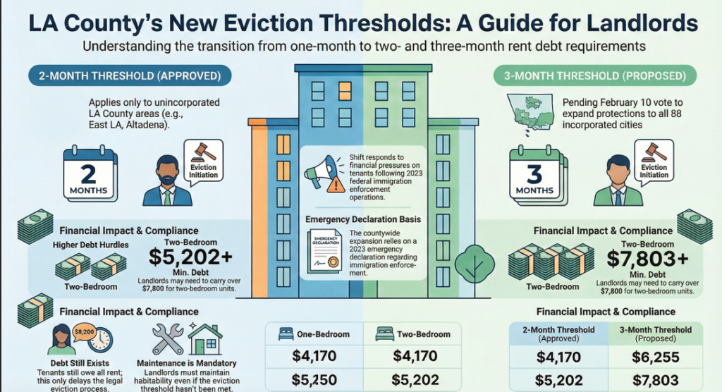 On February 3, the LA County Board of Supervisors voted 4-1 to raise the eviction rent debt threshold from one month to two months in unincorporated areas. A second motion , expanding the threshold to three months and applying it countywide, is scheduled for a vote on February 10. This article reflects what has been approved and what is pending as of publication. We will update this post as the situation develops.