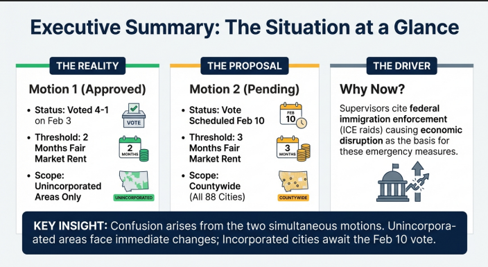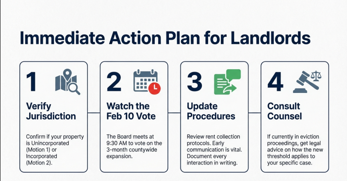 You’re not affected yet. Motion 1 doesn’t apply to you. But if Motion 2 passes on February 10, the three-month threshold would extend to properties in the City of Los Angeles, Pasadena, Glendale, Long Beach, and every other incorporated city in the county. Watch the February 10 vote closely.