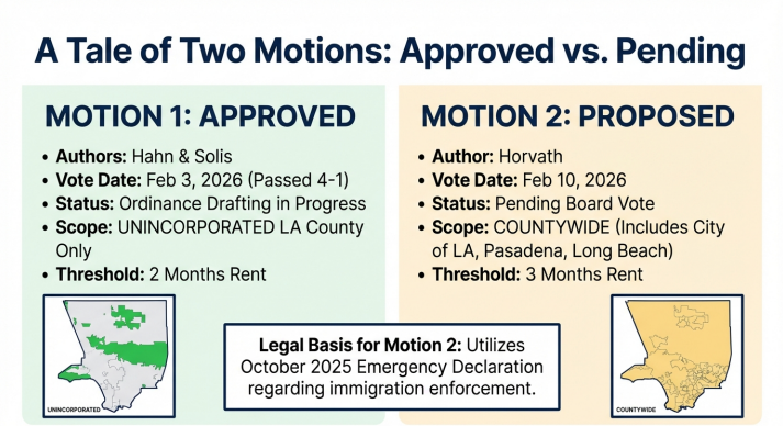 The countywide expansion under Motion 2 is the one generating the most debate. Supervisors Hahn and Solis have argued the County lacks authority to impose tenant protections on incorporated cities. Horvath disagrees, citing the emergency declaration as the legal basis. If Motion 2 passes, expect legal challenges.