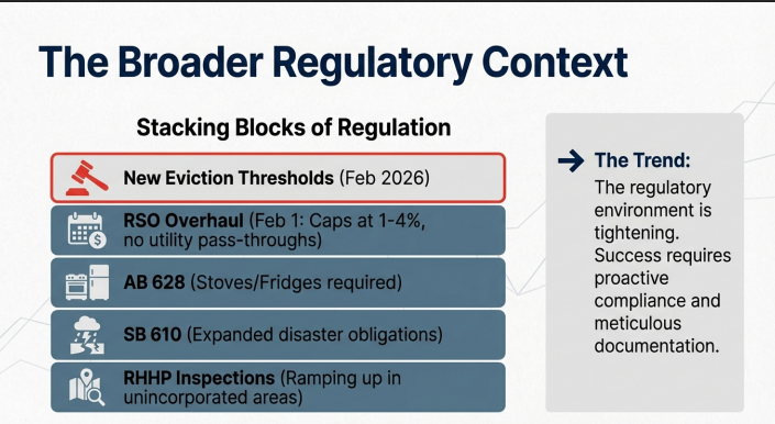 This is part of a broader trend. The RSO overhaul took effect February 1, capping increases at 1–4% and eliminating utility pass-throughs. AB 628 now requires stoves and refrigerators in all rental units. SB 610 expanded landlord obligations after disasters. RHHP inspections are ramping up across unincorporated areas.