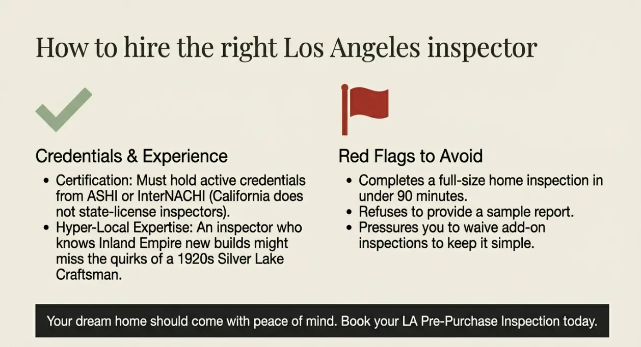 Use this checklist as your guide, attend your inspection in person, ask questions, and lean on a certified local inspector who knows the Los Angeles market inside and out.