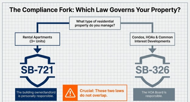 2. Confirm your deadline. Apartment owners under SB-721 have until January 1, 2026. HOAs and condo associations under SB-326 had a deadline of January 1, 2025, which has already passed.
