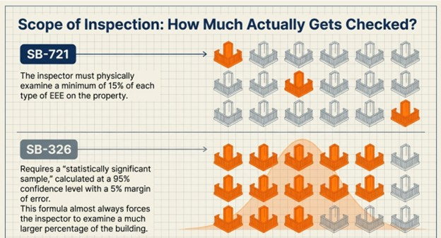Under SB-326, the inspector must use a statistically significant sample, calculated at 95 percent confidence with a 5 percent margin of error. In practice, this method often results in a larger percentage of elements being inspected than the 15 percent minimum under SB-721.
