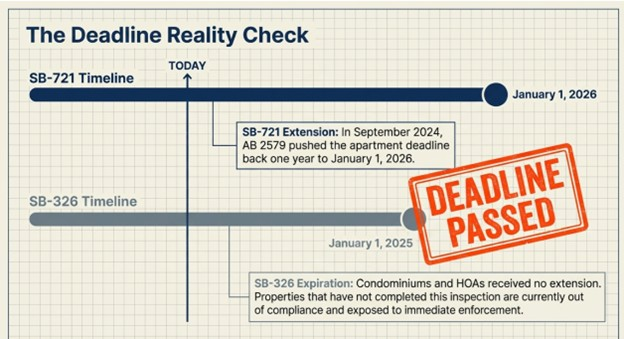 The SB-326 deadline for condominiums and HOAs was January 1, 2025, and it was not extended. If your HOA has not completed its inspection yet, you are already past the deadline and need to act right away.