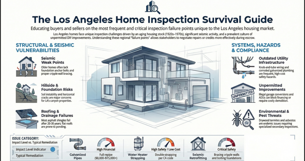 Los Angeles homes come with unique inspection challenges that set them apart from properties in other parts of the country. The region’s aging housing stock, Mediterranean climate, seismic activity, and culture of unpermitted improvements create a specific set of failure points that every buyer and seller should know. Below, we break down the most common issues found during home inspections in LA.