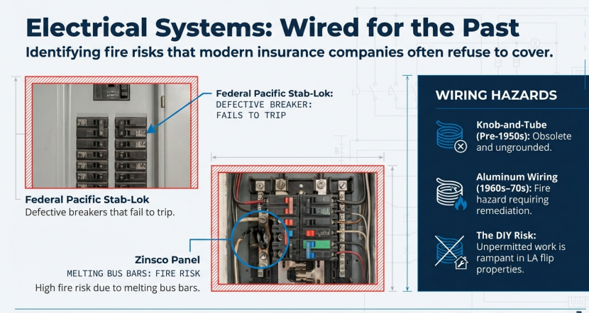 3. Unpermitted electrical work: LA has a particularly high rate of DIY and unlicensed electrical modifications. Uninspected work can create dangerous conditions and cause problems during escrow.