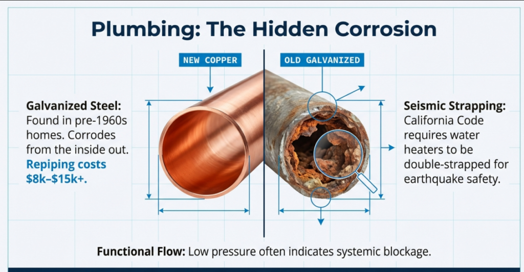 5. Water heater strapping: Verify your water heater is properly double-strapped per California code. This is a simple, inexpensive fix that often shows up on inspection reports.