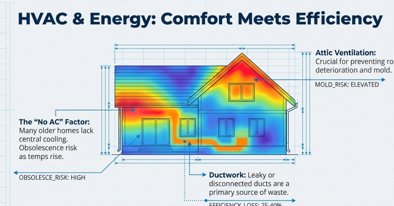 3. Ductwork and attic ventilation: Leaky ductwork, disconnected ducts, and poor attic ventilation are common in older homes and contribute to energy inefficiency and comfort issues. Inadequate attic ventilation can also accelerate roof material deterioration.