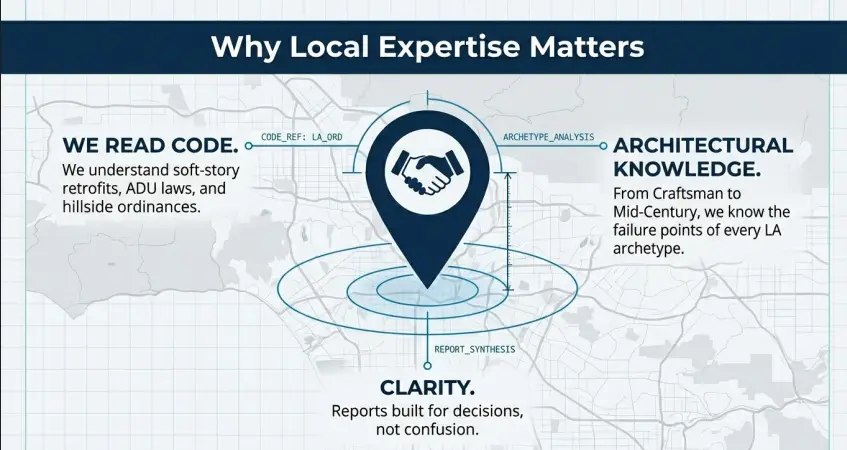 1. LA-specific code knowledge: Local inspectors understand the nuances of LA County and City building codes, permit requirements, and the mandatory retrofit programs that affect properties here.
